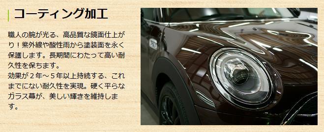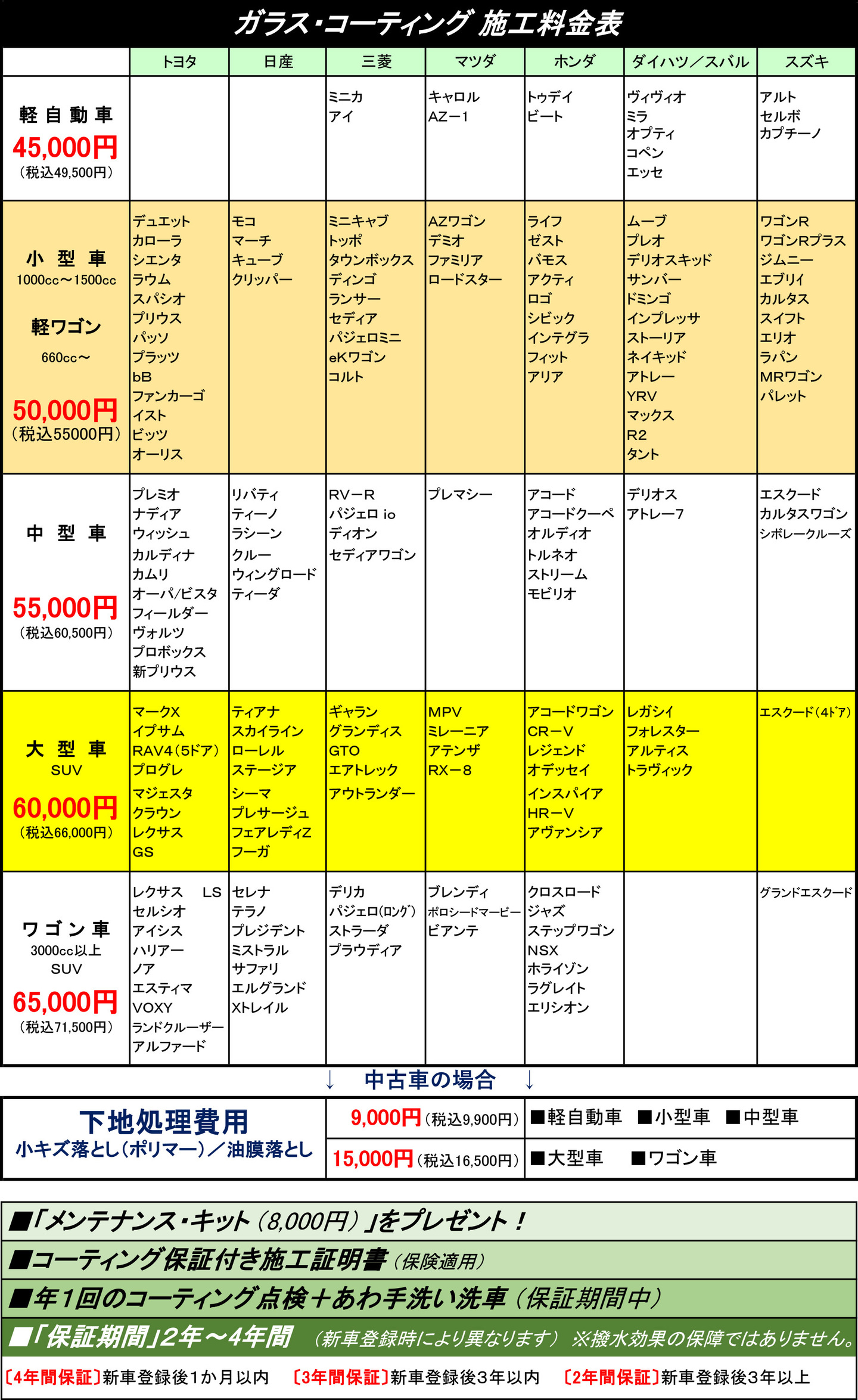 【下地処理費用について】小キズ落とし(ポリマー)/油膜落とし (中古車は別途費用(税別)7,500円/12,000円) ガラス樹脂コーティング お電話でのお問合せ 0823-71-7749 ※お問合せの祭は「車検証」をご準備下さい。 ネットでのお問合せ ↓