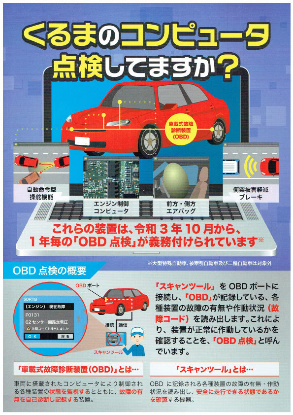 ■フロント・ブレーキ分解点検 ■リヤ・ブレーキ分解点検 ■足廻り点検 ■エンジン点検 ■冷却水漏れ点検 ■ワイパー点検 ■ブレーキオイル漏れ点検 ■エアコンガス点検 ■バッテリー点検 ■オートマチックオイル点検 ■排気ガス測定 ■ランプ電球切れ点検 ■タイヤ点検■OBD検査(スキャンテスター使用)